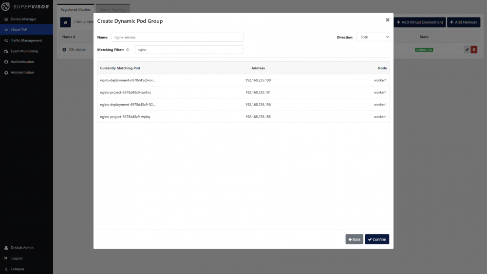 In this example, we will create a dynamic pod group called “nginx-service”, with matching filter “nginx”, to include any present and future pod with “nginx” in its name. Click the Confirm button to complete the creation of the pod group.