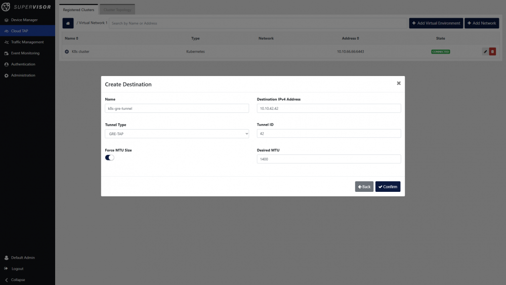 Again on the cluster details window, click the Create Destination button to begin creating a new tunnel destination. This is where the mirrored traffic from the application pods should be sent to, encapsulated in a GRE-TAP tunnel. Set a name, enter the IPv4 address of the destination, and enter the GRE-TAP tunnel ID. Set the MTU options as desired. Click the Confirm button to complete the creation of the tunnel destination.