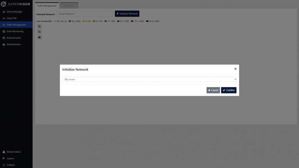 Select the appropriate network in the Selected Network drop-down menu at the top of the page. Click the Initialize Network button, select the Kubernetes cluster, and click Confirm.