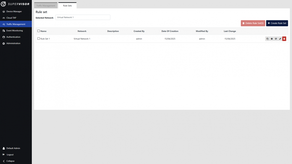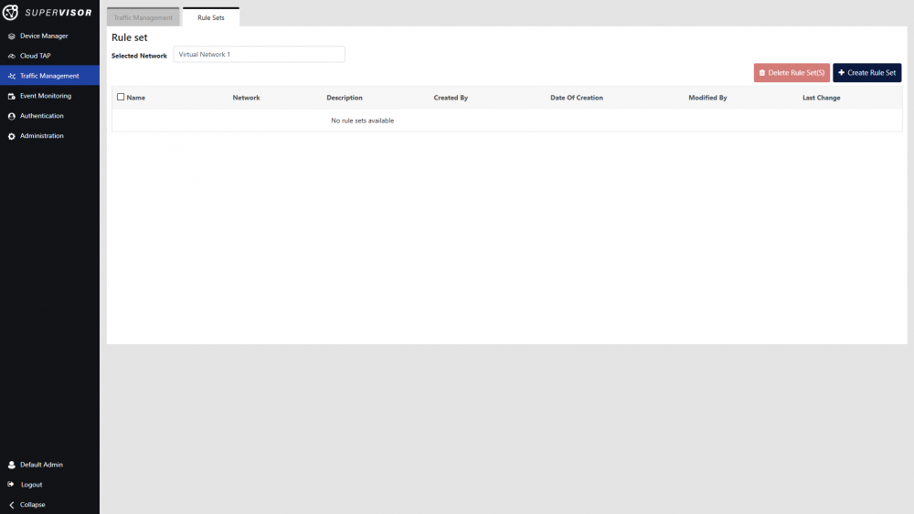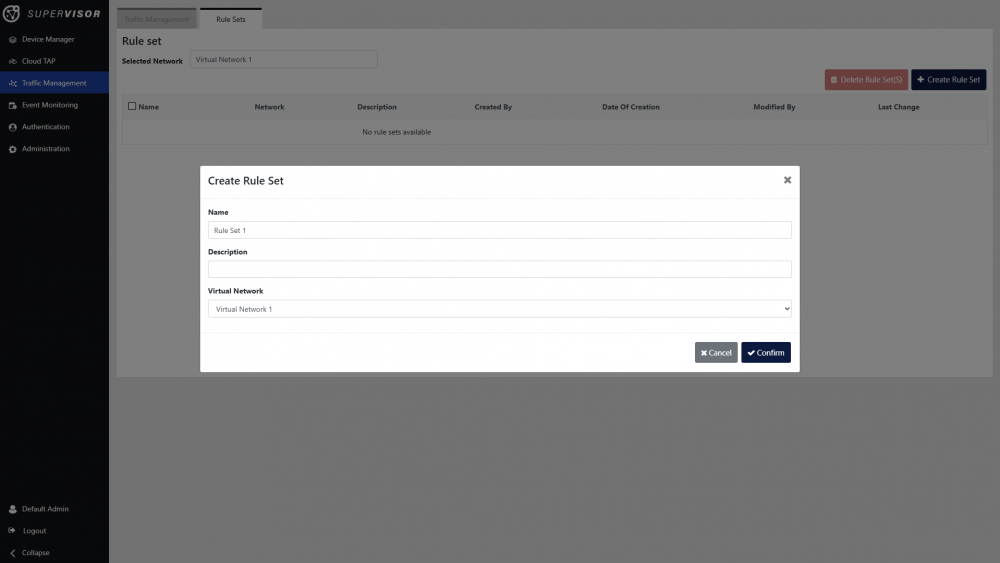 Click the Create Rule Set button to begin creating a new rule set. Enter a name and optionally a description for the rule set, ensure the selected Virtual Network is correct, and click Confirm.