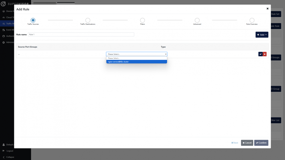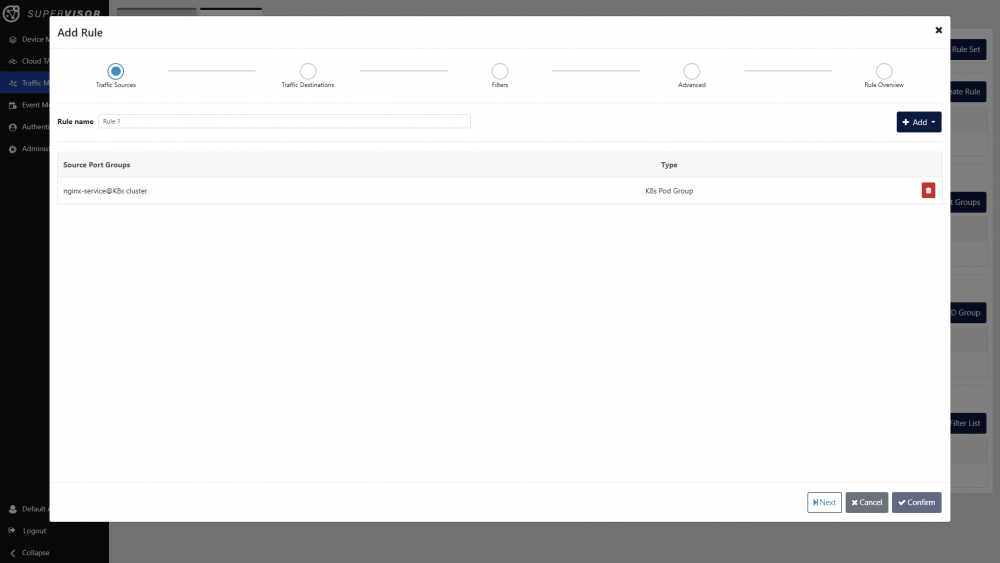 Click the Create Rule button to open the rule creation window. Enter a name for the rule, and select the traffic sources. In this case, we will select the pod group we have created earlier. Click the Add button, then the Add Pod Group option.