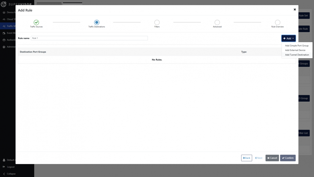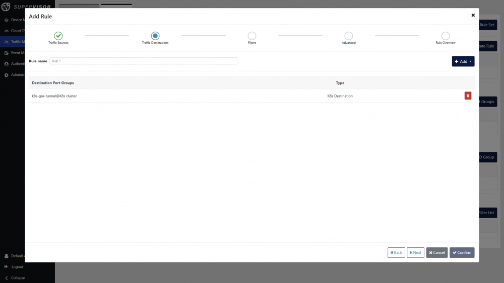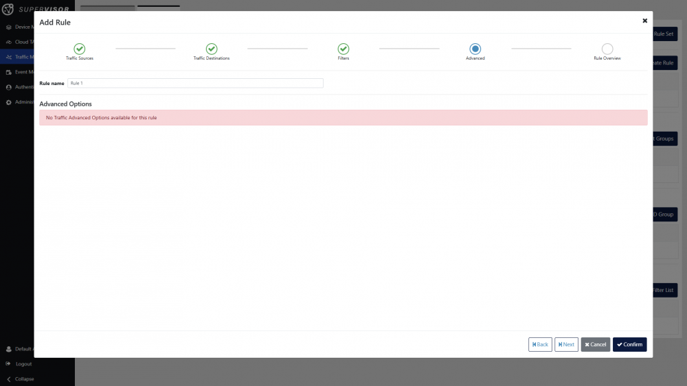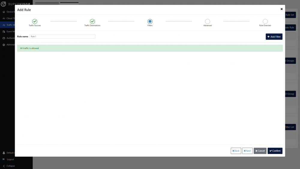Click the Next button at the bottom of the window or the Filters step at the top of the window. Traffic filters can be defined in this view, and are described in the Traffic management article. In this case, will create a rule without filtering.