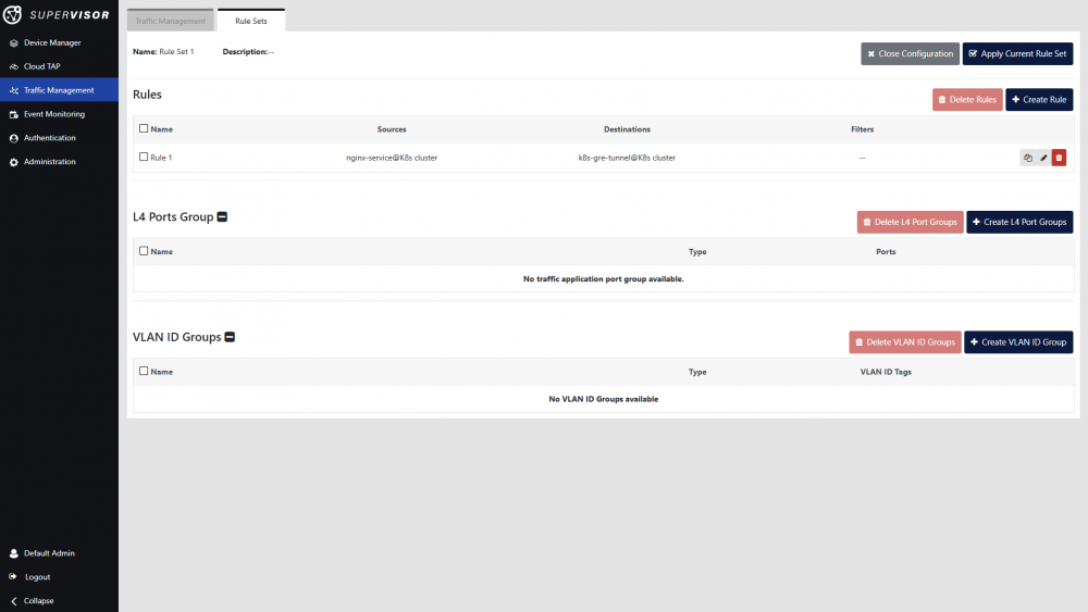 button to open the rule set. Rules, L4 port groups and VLAN ID groups can be created in this view. L4 port groups and VLAN ID groups are used for filtering in the traffic rules. In this case, we will create a simple rule.