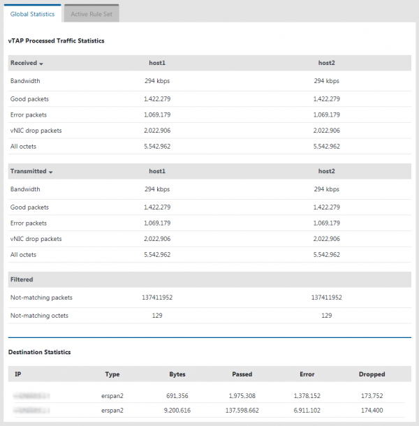 The vTAP Processed Traffic Statistics section provides aggregated statistics for all the hosts that are visible to the vTAP.